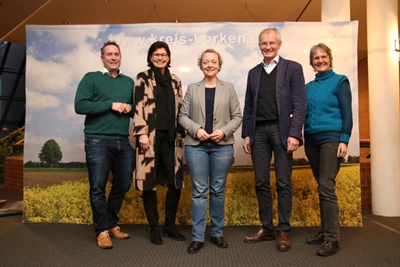 (v. re.) Landrat Dr. Kai Zwicker, Referentin Veronika Kendzia, Kreis-Gleichstellungsbeauftragte Jutta-Grave-Möllmann, Edith Brefeld und Dietmar Brüning (beide Orga-Team) bei der Fachtagung des Runden Tisches "GewAlternativen".