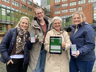 (v. li.): Barbara Wachs (Frauenhaus Bocholt), Sonja Schaten (Berufsbildungsstätte Westmünsterland), Tina Nagel (Frauen für Frauen Ahaus) sowie Edith Brefeld (Gleichstellungsbeauftragte der Stadt Gronau) präsentieren die neu aufgelegte Broschüre.