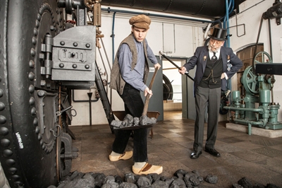Zwei Schauspieler begleiten die Teilnehmenden der "Living History"-Führung durch die Weberei.