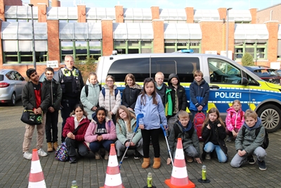 Bezirksdienstbeamter Rudolf Schlagenwerth erklärte den Schülerinnen und Schülern die einzelnen Elemente eines Streifenwagens.