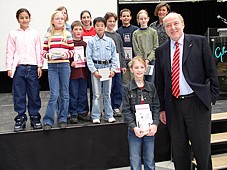 Der Kultursommer 2007 in Herten kann kommen: Veranstalter und Sponsoren machen schon Mal Werbung für das Theater "Der Schimmerlreiter" (Donnerstag, 23. August): Bernd Uppena (Leiter Kulturbüro), Bettina Hahn (Kulturbüro) als Deichgräfin auf dem Schimmel "Prinz" des Bauernhofes Freitag, Wilhelm Uhlenbruch (Volksbank Ruhr-Mitte), Oswald Petermann (Kulturbüro), Wolfgang Zerrahn (Prokurist Hertener Stadtwerke) und Kerstin Walberg (Pressesprecherin der Hertener Stadtwerke).