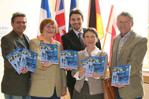 Bernd Uppena (Leiter Kulturbüro), Hildegard Maibaum (Vorsitzende Freundeskreis Doncaster), Bürgermeister Dr. Uli Paetzel, Erika Springstub (Stell. Vorstandsvorsitzende Arras-Freunde-Herten) und Karl-Heinz Egger (Vorsitzender Freundeskreis Szczytno-Herten) stellten die ersten druckfrischen Broschüren für die Europawochen vor.