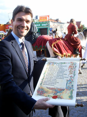 Ritter Jurand überreichte Bürgermeister Dr. Uli Paetzel eine Urkunde, für die sich Hertens Bürgermeister auf Polnisch bedankte.