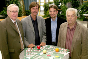 Kurt Dahlhaus (Bundessportwart und Vorsitzender der deutschen Billardjugend), Ulli Stromberg (Fachbereichsleiter für Bildung, Kultur und Sport), Bürgermeister Dr. Uli Paetzel und Dietmar Mielke (Vorsitzender des Billardclubs „Grüner Tisch Buer“) freuen sich auf die dritte Billard-EM im Hertener Glashaus.