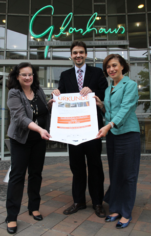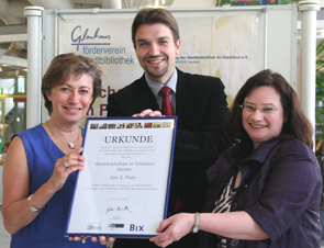 v. li.: Marie-Luise Karla (stellvertr. Leiterin Stadtbibliothek), Ulli Stromberg (Fachbereichsleiter Bildung, Kultur und Sport) und Bürgermeister Dr. Uli Paetzel freuen sich über die sehr guten BIX-Ergebnisse der Stadtbibliothek im Glashaus.