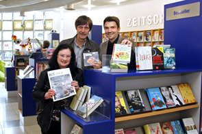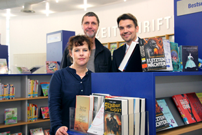 Leiterin der Stadtbibliothek Marie-Luise Karla, Fachbereichsleiter Bildung, Kultur und Sport Ulrich Stromberg und Bürgermeister Dr. Uli Paetzel freuen sich über die Topergebnisse des bundesweiten Bibliotheksindex.