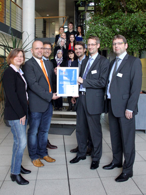 Brigitte Berkau (Wifö Stadt Herten), Michael Böhm (Vorstandsvorsitzender Wirtschaftsvereinigung Vest e.V.), Dr. Thomas Weiß (IHK Nord Wesfalen), Bürgmeister Dr. Uli Paetzel, Dr. Holger Müller (Eigentümer BlueSens) und Dr. Udo Schmale (Eigentümer BlueSens). Im Hintergrund: Studentisches Projektteam Vestischer Unternehmenspreis.