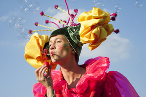 Beim Blumen- und Gartenmarkt setzt Petra Raith als Mademoiselle Fleur oder Miss Flora frühlingshafte Akzente. Wo sie auftaucht, bezaubert sie als Stelzenblume mit Charme und Musik oder mit bunten Seifenblasen. (Foto: Petra Raith)