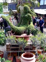 Imanuel Immergrün, 240 cm groß, farbenprächtig und des Lebens froh behält auf dem Blumen- und Gartenmarkt den Überblick.