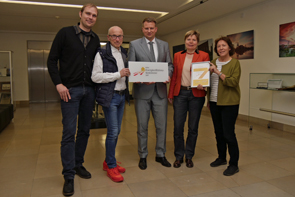 Bürgermeister Fred Toplak (2.v.l), Stadtbaurat Christoph Heidenreich (Mitte) und Babette Nieder, Susanne Barth und Jürgen Harks vom Klimateam der Stadt Herten freuen sich über die Zertifizierung.