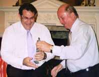 Empfang der Hertener Delegation im alten historischen Rathaus (256 Jahre alt): Willi Wessel überreicht Doncasters Bürgermeister Martin Winter als Gastgeschenk eine Nachbildung aus der Skulptur der Gruppe "Miteinander" in Herten vor dem Glashaus.