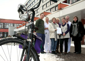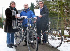 (v. li. n. re.:) Das Projektteam "fahrradfreundliche Stadt Herten" überreicht dem Radler des Monats seinen Preis: Lydia Schäfers, Roland Kerutt und Thomas Hammwöhner.