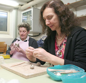 (v. li. n. re.:) Renate Funke, Schwester Maria Bernada, Gisela Fenske, Gruppenleiterin Ilse Weisel, Helga Spilker und Eleni Schüßler bei ihrem morgendlichen Keramikkurs.