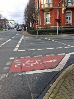 Zukünftig gelangen Radfahrer auf der Kaiserstraße sicher und unkompliziert auf die Distelner Straße. Hier ein Beispiel einer Markierung aus Recklinghausen, Herner Straße/Hohenzollernstraße.