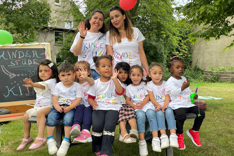 (v.l.n.r.) Die Tagespflegemütter Senem S. und Asiye S. freuen sich, dass Yasmin F., Berkay D., Camila X., Aista S., Sham F., Amina S., Medina S. und Honor A. im August in die Kita wechseln können.