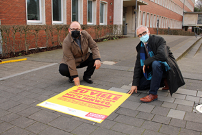 Bürgermeister Matthias Müller (rechts) und Selman Duran, Vorsitzender des Integrationsrats, werben am Bodenaufkleber vor dem Rathaus für eine Gesellschaft ohne Vorurteile und Rassismus. (Foto: Stefanie Hasler)