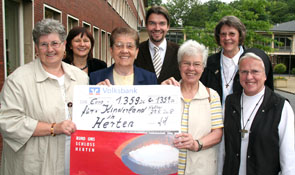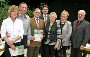 Matthias Latus (Vorsitzender Heimatverein Westerholt, vorne links) überreicht Karl-Heinz Heidbreder(Vorsitzenden des Bevollmächtigtenausschuss, vorne mitte) und Bürgermeister Dr. Uli Paetzel (vorne rechts). Berthold Hetterscheidt, Wilfried Enders, Peter Martschinke und Christel Latus (v.l.) vom Heimatverein Westerholt waren ebenfalls anwesend.