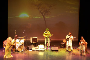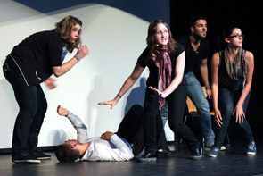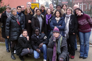 (v.l.) Jochen Geukes ("sozial aktiv"), Matthias Müller (Seminarleitung), Marlies Krause-Flaßbeck (AWO) und Benedikt Hahn (Seminarleitung) holen die Nachwuchskünster "Ganz vorne auf der Bühne drauf"!