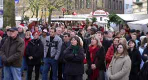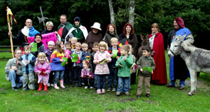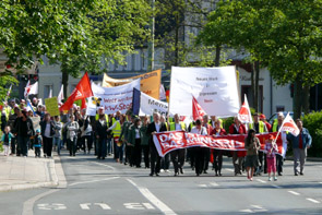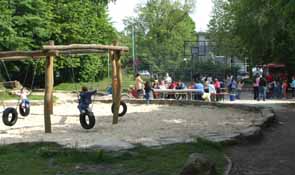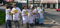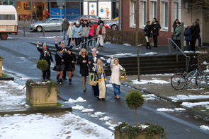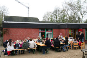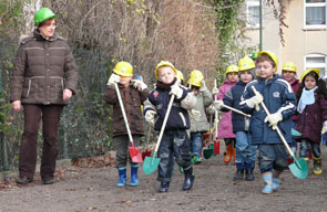 Die Kinder des AWO-Kindergartens "Abenteuerland" ziehen über die Baumtreppe auf den Otto-Wels-Platz. Begleitet wurden sie von der Gruppe Jazz Jerks.