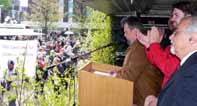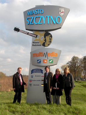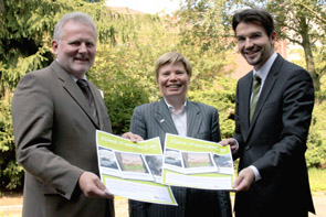 Herten ist fahrradfreundlich! Christine Fuchs (Geschäftsführerin Arbeitsgemeinschaft Fahrradfreundlicher Städte, Gemeinden und Kreise in NRW e.V.), Bürgermeister Dr. Uli Paetzel und Michael Groschek (NRW-Minister für Bauen, Wohnen, Stadtentwicklung und Verkehr) halten gemeinsam das neue Ortseingangsschild hoch.