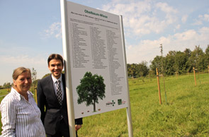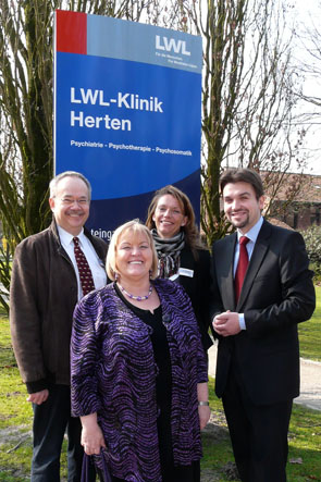 Vor dem Collagenschrank "mein tierisch grüner Daumen" (v.l.): Schirmherr Dr. Uli Paetzel, Astrid Neese (Vorsitzende der Geschäftsführung der Agentur für Arbeit Recklinghausen), Nanni Meyer-Knees (Beschäftigungsförderung Stadt Herten) und Till Hoffmann (BZgA).