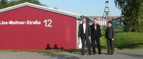 Regina Haastert (Jobcenter Kreis Recklinghausen), Michael Blume (Leiter Wirtschaftsförderung Stadt Herten), Bürgermeister Dr. Uli Paetzel und Endres Knapp (Geschäftsführer Spedition Knapp) vor dem Neubau an der Max-Plack-Straße auf Ewald.