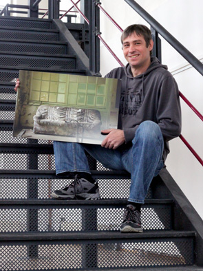 Michael Blume (Leiter der Wirtschaftsförderung), Frauke Wiering (Wirtschaftsförderung), Bürgermeister Dr. Uli Paetzel und DS-Spezialist Bernd Koslowksi in den neuen Werkstatträumen in Herten.