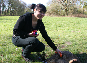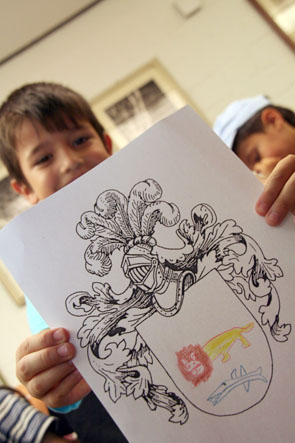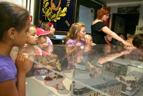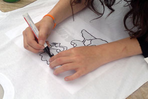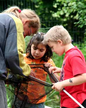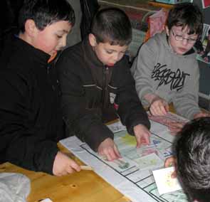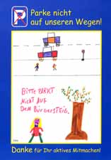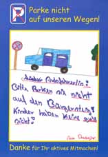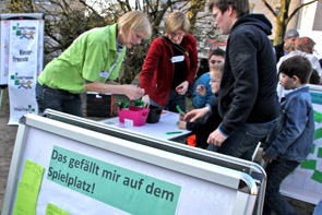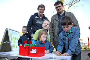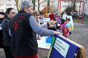 Beate Kleibrink von den Kinderfreunden zeigt den Kindern spielerisch mit Mal-Aktionen, wo Unfallgefahren entstehen können.