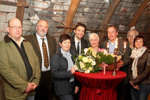 Markus Liptow, Peter Brautmeier (Fachbereichsleiter Bildung, Kultur, Sport), die Mutter von Markus Liptow, Edeltraud Liptow, Bettina Hahn (Kulturbüro) und Bürgermeister Fred Toplak (v.l.) stellen das Konzept des neuen Bistros 'Soup and Salad' im Glashaus vor.