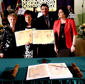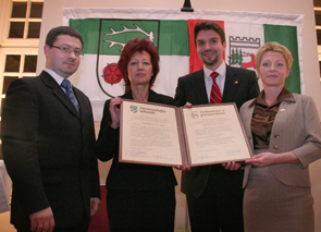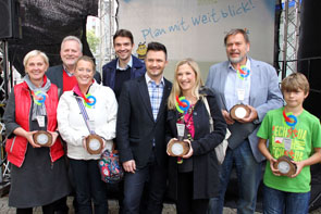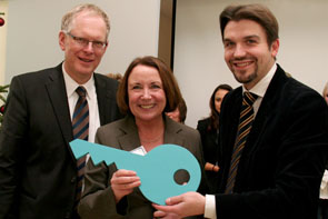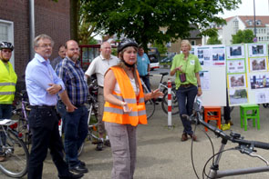 Christine Fuchs (Geschäftsführerin Arbeitsgemeinschaft Fahrradfreundlicher Städte, Gemeinden und Kreise in NRW e.V.), Bürgermeister Dr. Uli Paetzel und Michael Groschek (NRW-Minister für Bauen, Wohnen, Stadtentwicklung und Verkehr) unterzeichnen gemeinsam die Urkunde.