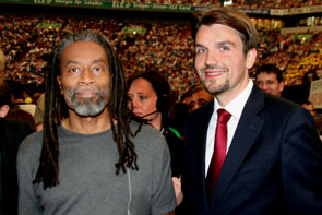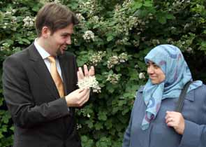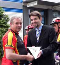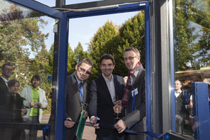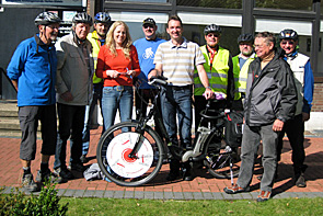 NRW-Minister für Bauen, Wohnen, Stadtentwicklung und Verkehr Michael Groschek und Bürgermeister Dr. Uli Paetzel (rechts) auf dem Weg ins Glashaus zur Urkundenübergabe. Mit dabei: Das Fahrradbotschafter-Pedelec von Uli Paetzel, der damit einen Monat lang durch Herten radelte.