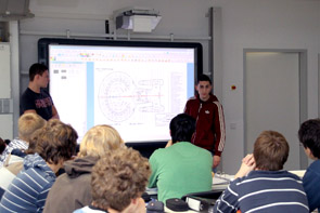 Jürgen Eilers, Tutor der Klasse 8.4 zeigt Sonja (13) und Michelle (13) was sie bei der Gestaltung ihres Flyers noch verbessern können.