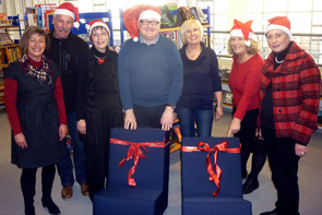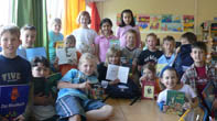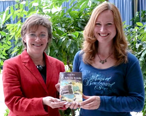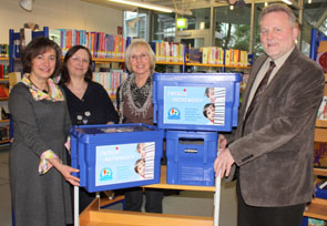 „Fit von klein auf“ – Florina erklärt, wie es geht. Beate Buiting (links) von der BKK übergibt Silvia Konze (Mitarbeiterin Bibliothek im Glashaus) fünf Gesundheitskoffer, mit vielen Tipps rund um das Thema Gesundheit.