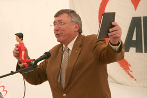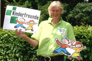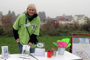 Beate Kleibrink von den Kinderfreunden stellt mit Plakaten am Info-Stand die verschiedenen Schilder vor.