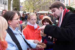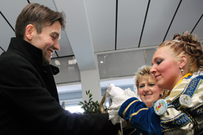 Bürgermeister Dr. Uli Paetzel und Carsten Debler, Leiter der Dekra Niederlassung Essen überreichen den Kindern der Thomas-Kita die roten "Sicherheits-Kappen".