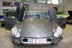 KFZ-Meister Bernd Koslowski (links) und Bürgermeister Dr. Uli Paetzel (rechts) in einem Citroen DS-Modell.