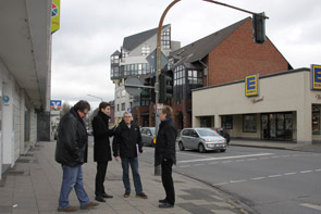 Georgius Kamarianakies (Inhaber Ladenlokal), Business-Coach Frank Alexander, Brigitte Berkau (Wirtschaftsförderung Stadt Herten), Wolfgang Seidel (Fachbereichsleiter Stadtentwicklung und Wirtschaftsförderung) und Gabriele Kaczmarek (Büro NutzungsManagement) stehen vor einem der freien Ladenlokale. (v.l.)