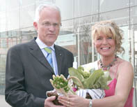 Bettina Hahn (Kulturbüro) und Wilhelm Uhlenbruch (Leiter Marketing, Volksbank Ruhr Mitte) stellen das neue "7nach8"-Programm im Glashaus vor.