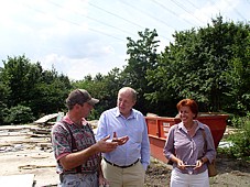 Bürgermeister Klaus Bechtel und Fachbereichsleiterin Annegret Sickers im Gespräch mit Frank Schmidt (l.), dem neuen Eigentümer der Wohncontainer.