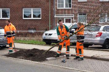 An der Backumer Straße haben die städtischen Gärtner Harald Magnussen, Ludger Dittrich und Michael Broser zusammen mit dem Auszubildenden Kevin Schindler die rund drei Meter hohen Linden bereits gepflanzt.
