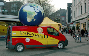 Das „Eine Welt mobil“ informiert in seinem Zelt mit Ausstellungsfahnen und Infomaterialien rund um das Thema Kakao und zeigt Bedingungen der Arbeiter und Produzenten vor Ort.