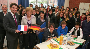 Mehr als 40 Schüler aus Arras, Hertens französischer Partnerstadt, besuchten Deutschland im November 2012. Bürgermeister Dr. Uli Paetzel (2. Reihe, vorne rechts), Detlef Fronda (Vereinsmanager, vorne links), Mitglieder des Fördervereins und Direktorin Bärbels Schweers begrüßten die Gruppe im Café Kunterbunt.