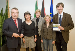 Staatssekretär für Kultur Hans-Heinrich Grosse-Brockhoff gratulierte den Vertretern aus Herten Sabine Weißenberg (Kulturbüro), Sabine Fiebig (Musikschule), Brigitte Surmann (CreativWerkstatt) und Ulli Stromberg (Fachbereichsleiter Bildung, Kultur und Sport) (v.l.)