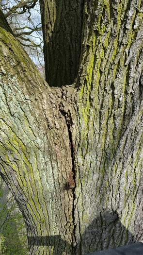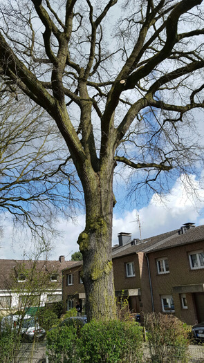 Bei der heutigen Kontrolle ist im Bereich des Spielplatzes an der Franzstraße in Langenbochum eine über 100 Jahre alte Eiche aufgefallen. Ein langer Riss zog sich durch die Baumkrone.
