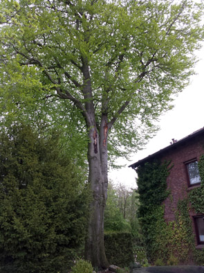 Bei der heutigen Kontrolle ist im Bereich des Spielplatzes an der Franzstraße in Langenbochum eine über 100 Jahre alte Eiche aufgefallen. Ein langer Riss zog sich durch die Baumkrone.