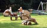 Die Holztiere, die im Rahmen der Beschäftigungsförderungsmaßnahmen im Katzenbusch eingezogen sind, laden die Kinder zum Spielen ein.