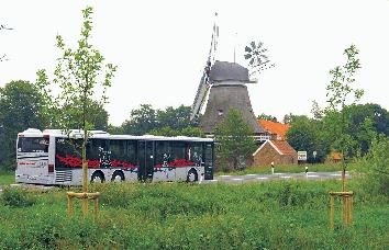Mit dabei Stefan Johnke (v.l.), zuständig für den ÖPNV beim Landkreis Leer, Thomas Mittwollen zuständig für den ÖPNV beim Landkreis Ammerland, Gerd Dählmann, Bürgermeister von Hesel und Vertreter der Samtgemeinde Hesel, Landrat Matthias Groote, Malte van Mark, Allgemeiner Vertreter des Bürgermeisters Gemeinde Uplengen, Viola Henning, Stephan Reich, Leiter Marktbearbeitung, und Antje Peters (alle Weser-Ems-Bus) sowie Torsten Stephan, Sachgebietsleiter für Gemeindeentwicklung, Klimaschutz und Tourismus Gemeinde Uplengen.