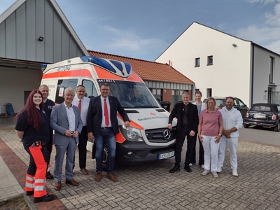 Die Rettungssanitäter Lilian Kanaan und Alexander Luiking, Landrat Matthias Groote, der Rettungsdienstleiter des DRK Leer, Adrian Raue, Markus Wucherpfennig, Geschäftsführer der Rettungsdienst GmbH des DRK-Kreisverbandes Leer, sowie der Leiter der Rhauderfehntjer Rettungswache, Hans Joachim Reinke, Ute Buntrock, Dezernentin der Kreisverwaltung, und das Ehepaar Michaela und Dr. André Di Nanni von der Arztpraxis „Alte Feuerwache“ in Collinghorst, die dem DRK Räume und Garage vermietet haben.