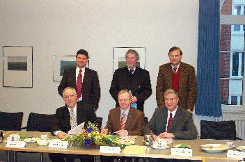 Auf dem Foto 1 von links: Landrat Jörg Bensberg (Ammerland), Oberbürgermeister Alwin Brinkmann (Emden), Landrat Walter Theuerkauf (Aurich), Landrat Bernhard Bramlage (Leer), Landrat Manfred Bergner und Oberkreisdirektor Jürgen Mumdey (beide Wesermarsch).