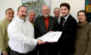 Matthias Latus (Vorsitzender Heimatverein Westerholt, vorne links) überreicht Karl-Heinz Heidbreder(Vorsitzenden des Bevollmächtigtenausschuss, vorne mitte) und Bürgermeister Dr. Uli Paetzel (vorne rechts). Berthold Hetterscheidt, Wilfried Enders, Peter Martschinke und Christel Latus (v.l.) vom Heimatverein Westerholt waren ebenfalls anwesend.